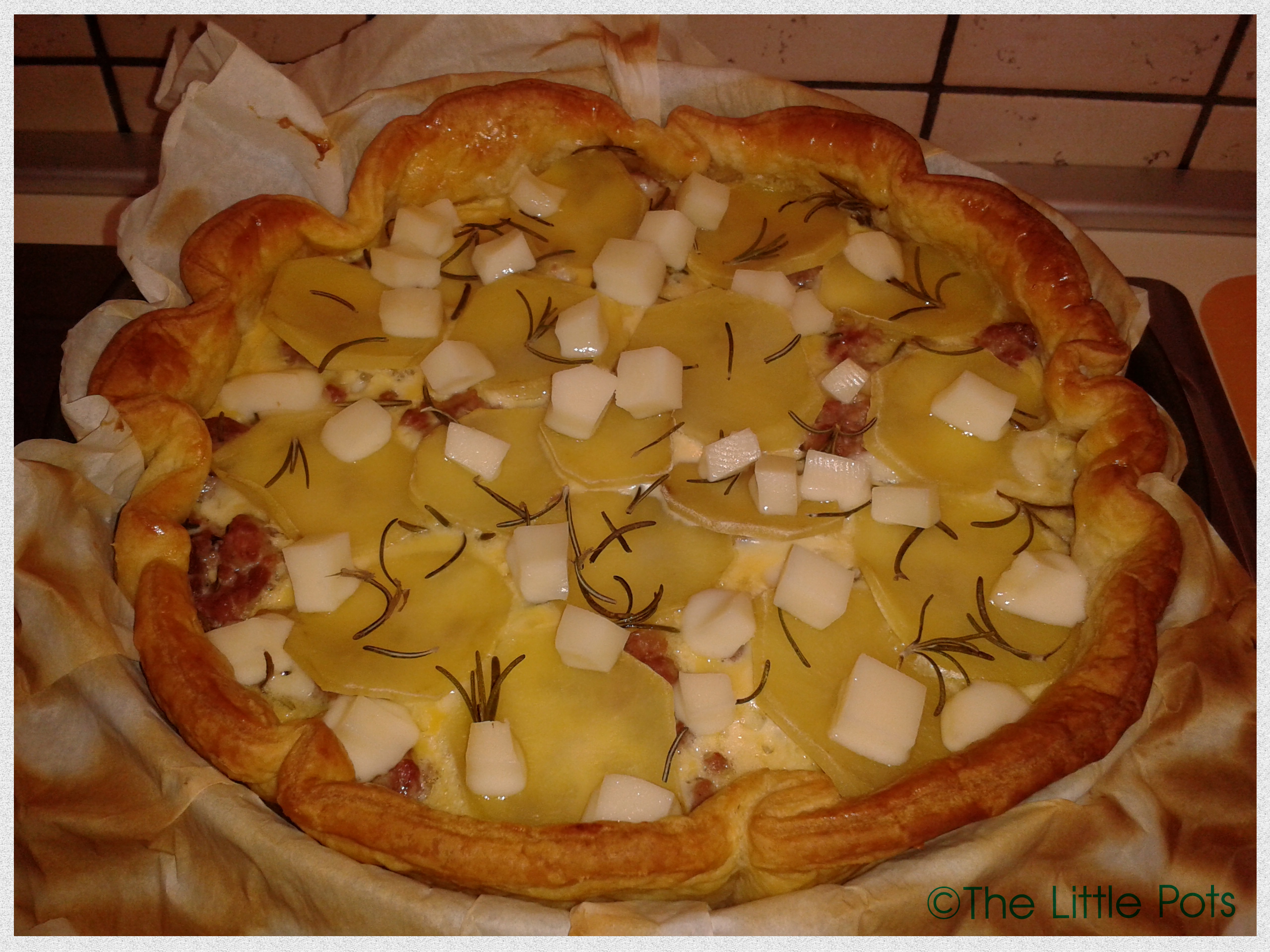 Con la carta forno fodero una tortiera di circa 26cm di diametro, stendo la pasta sfoglia facendola aderire bene ai bordi, la bucherello con una forchetta e spennello il tutto con un rosso d’uovo. Dopodichè verso il composto che abbiamo ottenuto precedentemente nella tortiera, livellandolo, e comincio con le decorazioni: dispongo le fettine di patata a coprire l’intera superficie della torta, aggiungo del rosmarino e una macinata di pepe… e via in forno per 30 minuti circa!