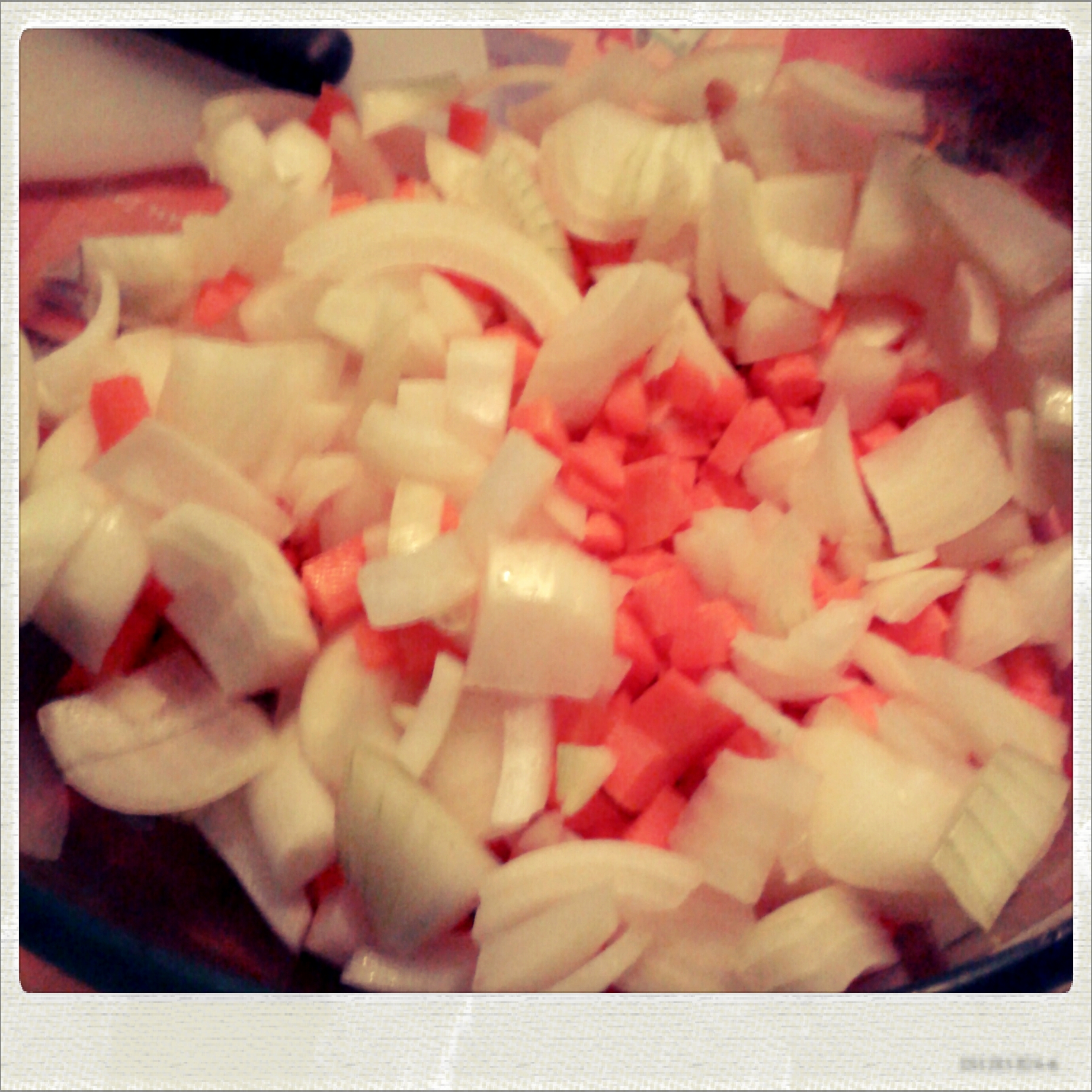 Passiamo ora ai miniburger. In una bacinella abbastanza capiente, tritato la cipolla grossolanamente, taglio le carote a dadini e aggiungo i ceci e le lenticchie (io ho usato sia i ceci che le lenticchie precotti, perchè avevo poco tempo).