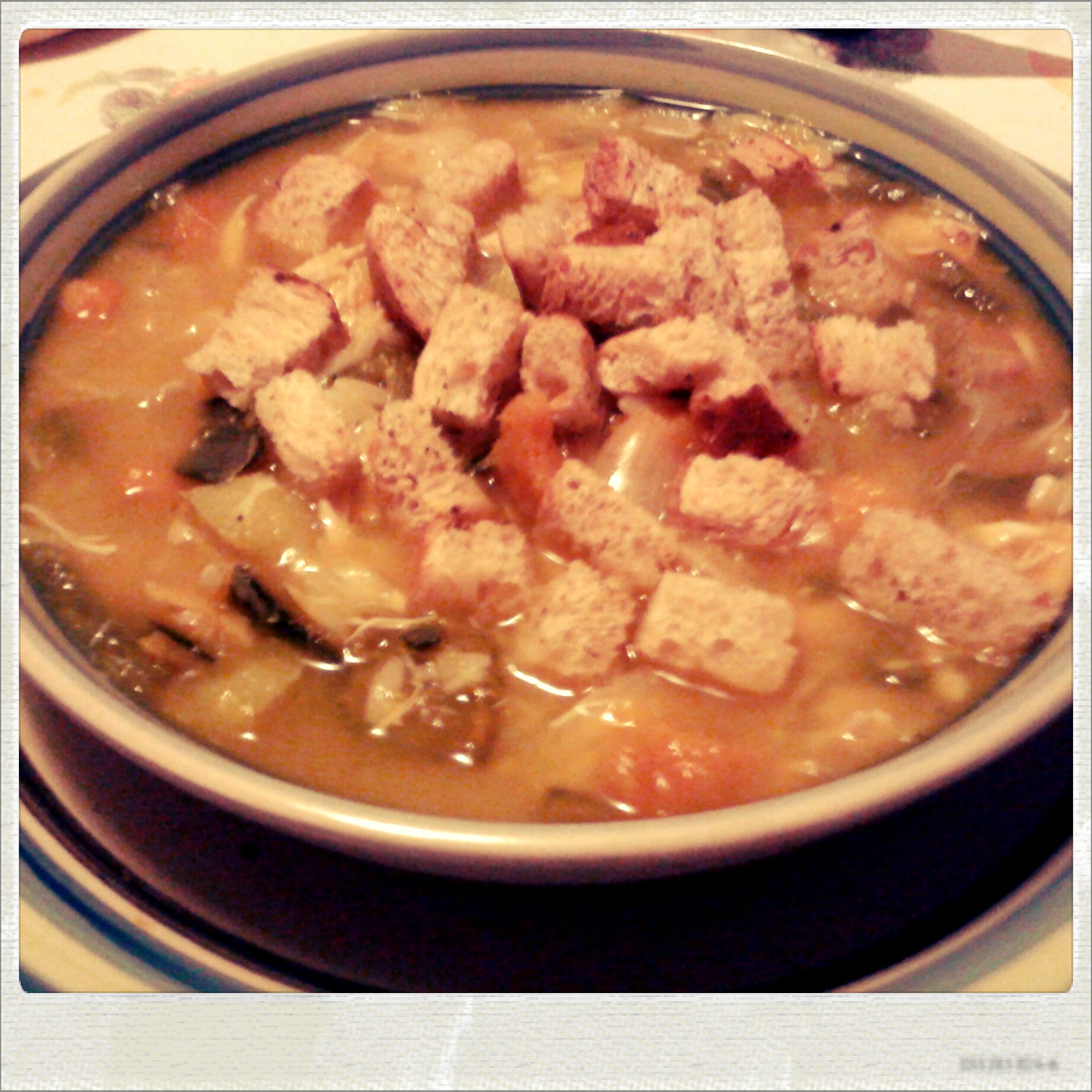 In una pentola abbastanza capiente metto a bollire l’acqua con un cucchiaino di dado granulare, il pollo e le verdure intere. Quando le verdure sono cotte le tolgo e le lascio raffreddare, per il pollo ci vorrà qualche minuto in più; una volta cotto il pollo lo tolgo dal brodo ottenuto, che continuo a far sobbollire. Taglio la zucchina a cubetti e anche la zucca (io lascio la buccia perchè mi piace, se non vi piace potete usare solo la polpa), taglio a pezzettini i cornetti e la cipolla. Il pollo è ormai tiepido e lo privo della pelle, lo disosso e lo taglio a pezzettini. Alzo il fuoco, rimetto il pollo e le verdure nel brodo mescolando spesso; quando ricomincia a bollire butto la pastina. Faccio cuocere per una decina di minuti, mescolando spesso in modo che la zucca si sfaldi e dia cremosità al brodo. Nel frattempo taglio a cubetti il pane e lo tosto in una pentola antiaderente con delle erbe aromatiche secche e un pizzico di curry.