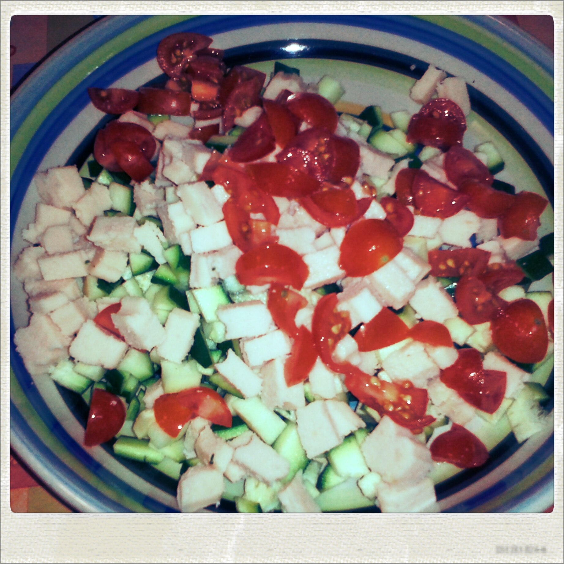 Per prima cosa con un pelapatate ricavo 12 fettine sottili di zucchina che metto da parte, dopo di che taglio il resto delle zucchine a dadini piccoli piccoli (devono essere piccoli perchè vanno crudi nell’impasto e cuoceranno poi in forno), 10 pomodorini a spicchi e il tacchino a cubetti (vi consiglio di prendere una fetta spessa di tacchino – l’affettato – dal macellaio, altrimenti va bene qualsiasi altro affettato vogliate).