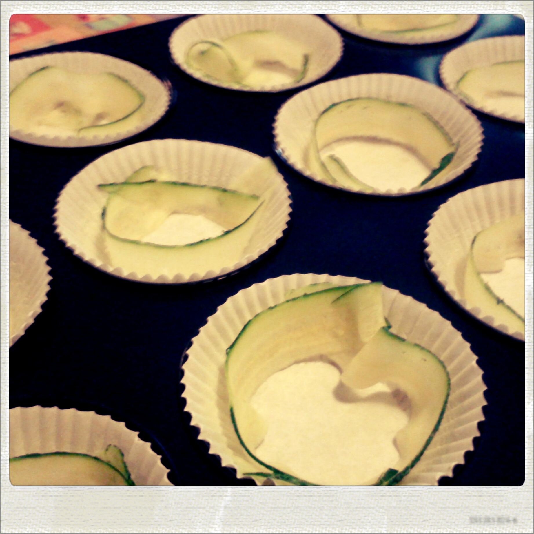 Passiamo ora all’impasto: in una ciotola ho montato con le fruste elettriche le uova e il latte; ho aggiunto l’olio di semi a filo senza mai spegnere le fruste e il philadelphia. Setaccio la farina e il lievito e li aggiungo all’impasto, lavro con le fruste fino ad ottenere un composto omogeneo. Aggiungo al composto le verdure tagliate, il tacchino, il parmigiano e il pecorino; aggiusto di sale, una spolverata di prezzemolo, un pizzico di peperoncino e una macinata abbondante di pepe. Mescolo delicatamente il tutto con un cucchiaio e lascio riposare il composto mentre preparo i pirottini. Utilizzando le zucchine che avevo tagliato con il pelapatate fodero i pirottini facendo una “base” come si vede in foto.