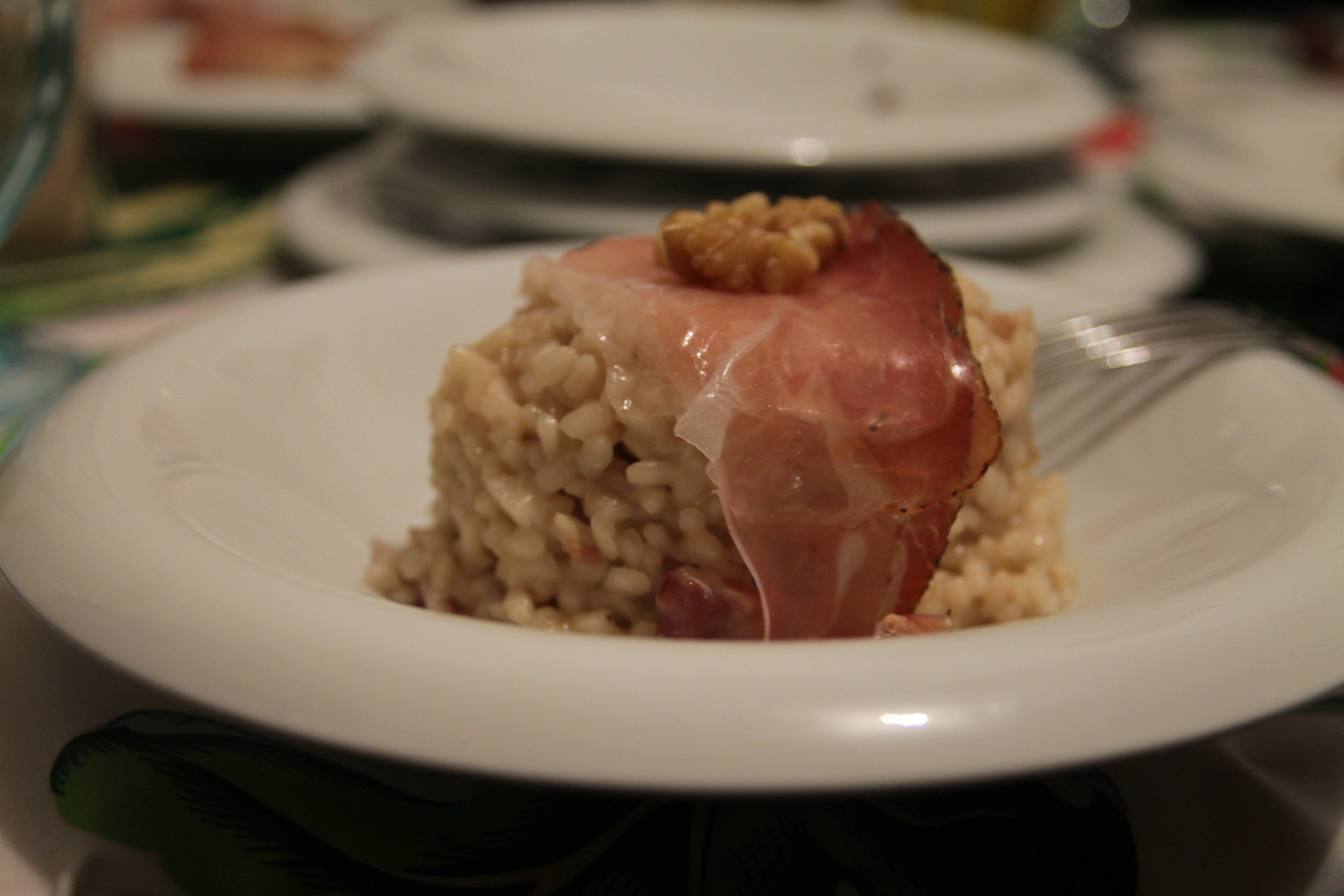 Metto sul fuoco una pentola con dell’acqua e porto a bollore. Dopodichè ho preparato il soffritto: un filo d’olio, una noce di burro, la cipolla sminuzzata; mentre ho fatto appassire la cipolla ho sminuzzato le noci, lasciandone da parte qualche pezzetto per la decorazione. Aggiungo le noci e il riso, faccio tostare per qualche minuto e sfumo con il vino: una volta che il vino è evaporato aggiungo un misurino di dado granulare e copro il riso con l’acqua bollente. * Piccola digressione: io preferisco mettere il dado nel riso in quanto rimane più saporito e non si spreca l’eventuale brodo rimasto. #iconsiglidellamianonnina*. Porto il riso a cottura aggiungendo acqua quando è necessario e nel frattempo tagliola fetta spessa di speck a cubetti: aggiungo il parmigiano, un pezzettino di burro, lo speck a cubetti e lascio riposare qualche minuto mettendo il coperchio alla padella. Preparo i piatti, facendo una piccola decorazione circolare con la glassa di aceto balsamico, con il coppapasta faccio una torretta di riso in ogni piatto e decoro con una fetta di speck e qualche pezzetto di noce.