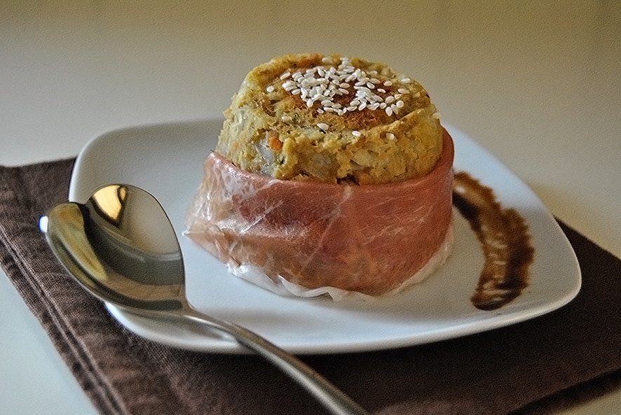In una pentola antiaderente ho messo i 3 miniburger appena tolti dal freezer con il latte: fiamma bassa e coperchio finchè non si sono scongelati. Nel frattempo ho messo sul fuoco una pentola con acqua salata per bollire il riso; ho pelato la patata, tagliata a fettine sottilissime e messa in acqua fredda in modo che non si annerisca; ho grattato il parmigiano: basta un cucchiaino per ogni tortino. Una volta bollito il riso, che ho lasciato al dente, l’ho unito ai miniburger che ormai hanno formato una cremina insieme al latte, mescolo bene il tutto e divido il composto nei tre stampini. Copro il tortino con le fettine di patata, un po’ di sesamo e il parmigiano: inforno in forno ventilato  a 200° per 15 minuti e poi gratino per 6 minuti nella parte più alta del forno. Una volta cotti, li ho lasciati raffreddare qualche minuto, ribaltati sul piatto da portata e avvolti in una fetta di crudo: decoro con qualche semino di sesamo il top e il piatto con della glassa di balsamico.