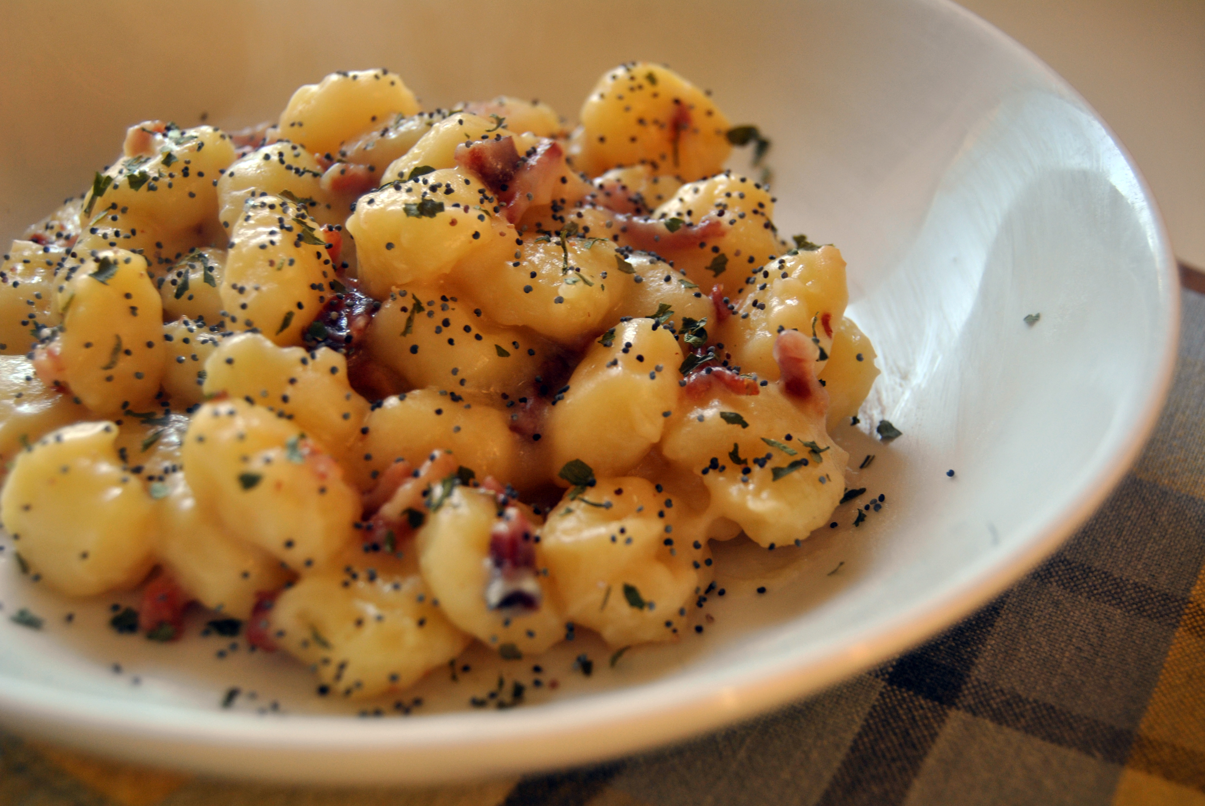 Ho messo l’acqua a bollire in una pentola alta e nel frattempo ho fatto abbrustolire lo speck con un filo d’olio extravergine d’oliva. Quando l’acqua ha iniziato a bollire ho calatogli gnocchi e quando hanno cominciato a venire a galla li ho trasferiti nella padella dove ho abbrustolito lo speck: ho aggiunto il latte e parmigiano a piacere, lasciando cuocere a fuoco basso finchè non si forma una cremina che unisce bene gli gnocchi. Impiatto, metto un po’ di prezzemolo secco tritato e dei semi di papavero. Piatto velocissimo ma gustosissimo.