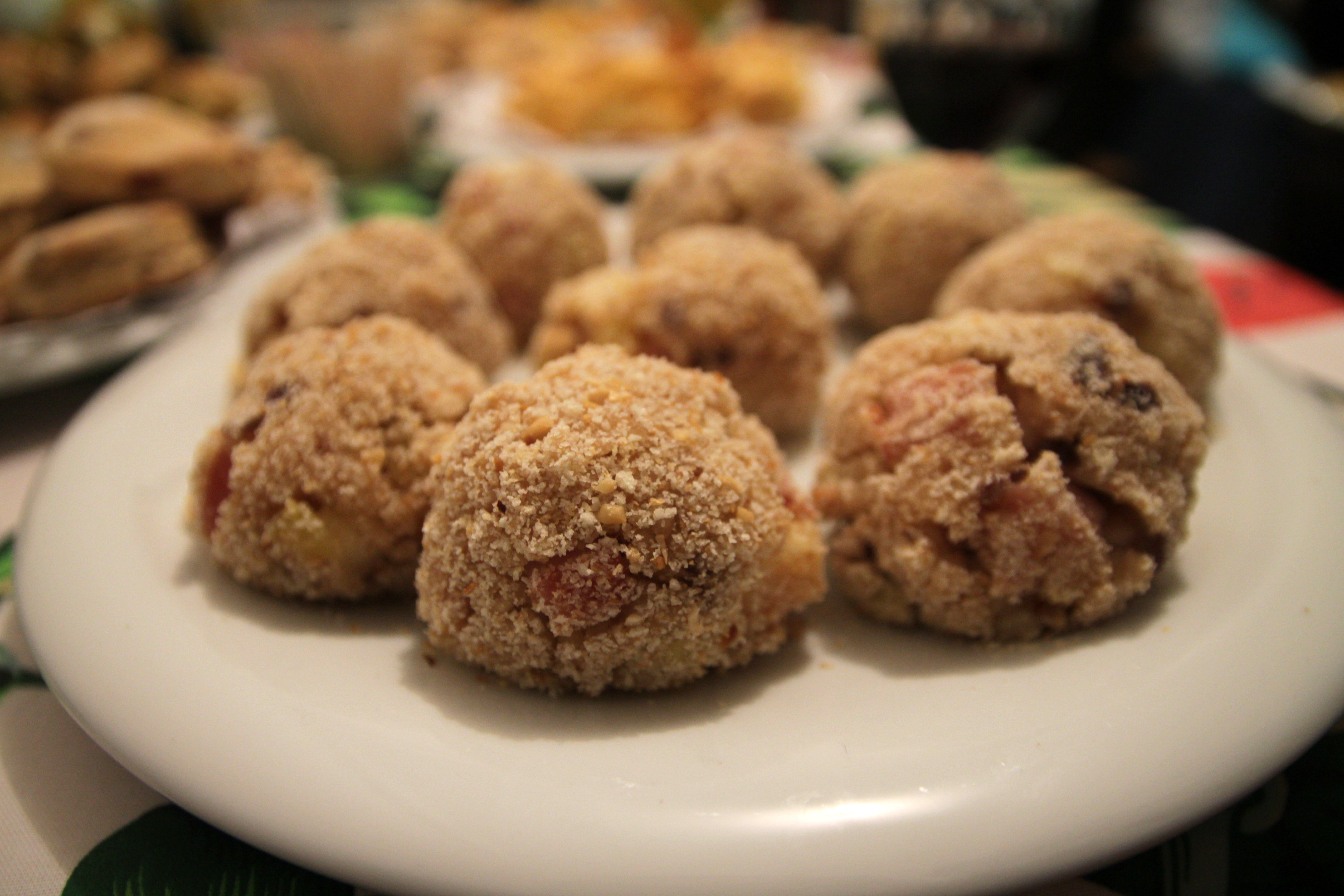 In una pentola alta ho messo a bollire l’acqua; ho tagliato la cipolla molto sottile e l’ho messa con un filo d’olio in una wok per cominciare a preparare il soffritto. Mentre la cipolla si abbrustolisce ho tagliato il prosciutto a dadini e l’ho aggiunto al soffritto: faccio saltare per qualche minuto e aggiungo il riso, lo tosto per bene e aggiungo un misurino di dado granulare e il prosecco. Una volta che il prosecco è evaporato, copro il riso con acqua  bollente e continuo la cottura. Nel frattempo sbuccio la patata, la taglio a pezzettini piccoli piccoli, la aggiungo al risotto e continuo ad aggiungere acqua finchè non sarà cotto: consiglio di lasciare il riso al dente, visto che verrà cotto ancora in forno per una ventina di minuti. Spengo il fuoco, aggiungo il parmigiano e lascio riposare una decina di minuti. Mentre aspettavo che il riso si raffreddasse ho acceso il forno a 200°C e ho preparato il necessario per l’impanatura: ho mescolato il pangrattato con la granella di nocciole, sale e pepe.  Una volta che il risotto si è raffreddato ho aggiunto le noci a pezzettini e formato delle palline mettendo all’interno un cubetto di galbanino. Ho passato le palline nell’impanatura, compattandole per bene e infornato per circa 20 minuti: gli arancini saranno pronti quando la panatura diventerà dorata.