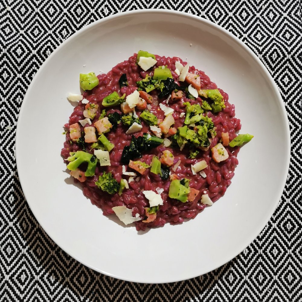 Mentre porto a cottura il risotto, faccio cuocere la carota a vapore e una volta cotta la frullo con un mestolo di brodo. La pancetta tagliata a cubetti vado a cuocerla in padella fino a renderla croccante mentre il broccolo tagliato a pezzettini lo salto in una padella con un goccio di brodo.